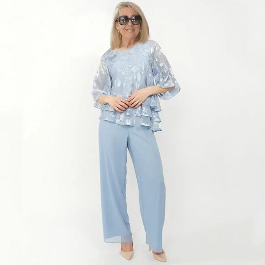 Elegancki komplet składający się z bluzki z rękawem 3/4 i wzorzystych spodni