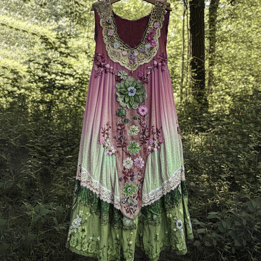 Sukienka maxi z lnu w stylu vintage z wzorem białej róży