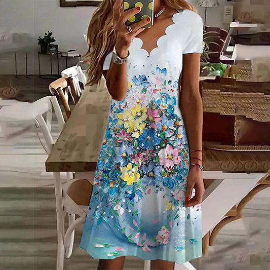 Nowa bohemian średniej długości sukienka z dekoltem w serek i nadrukiem