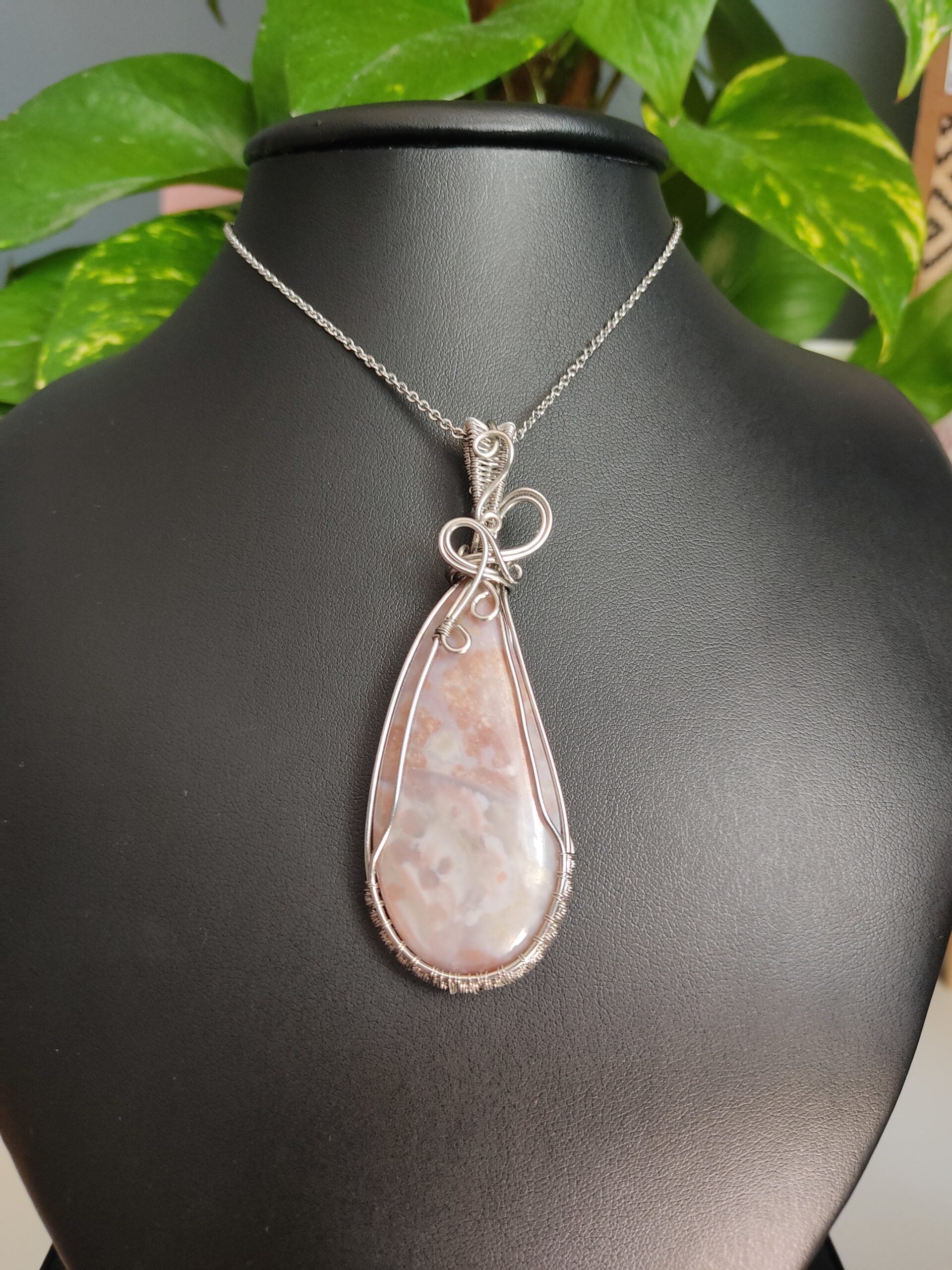 Ręcznie robiony wisiorek z agatem. Wykonany techniką wire wrapping z drutów ze stali chirurgicznej.