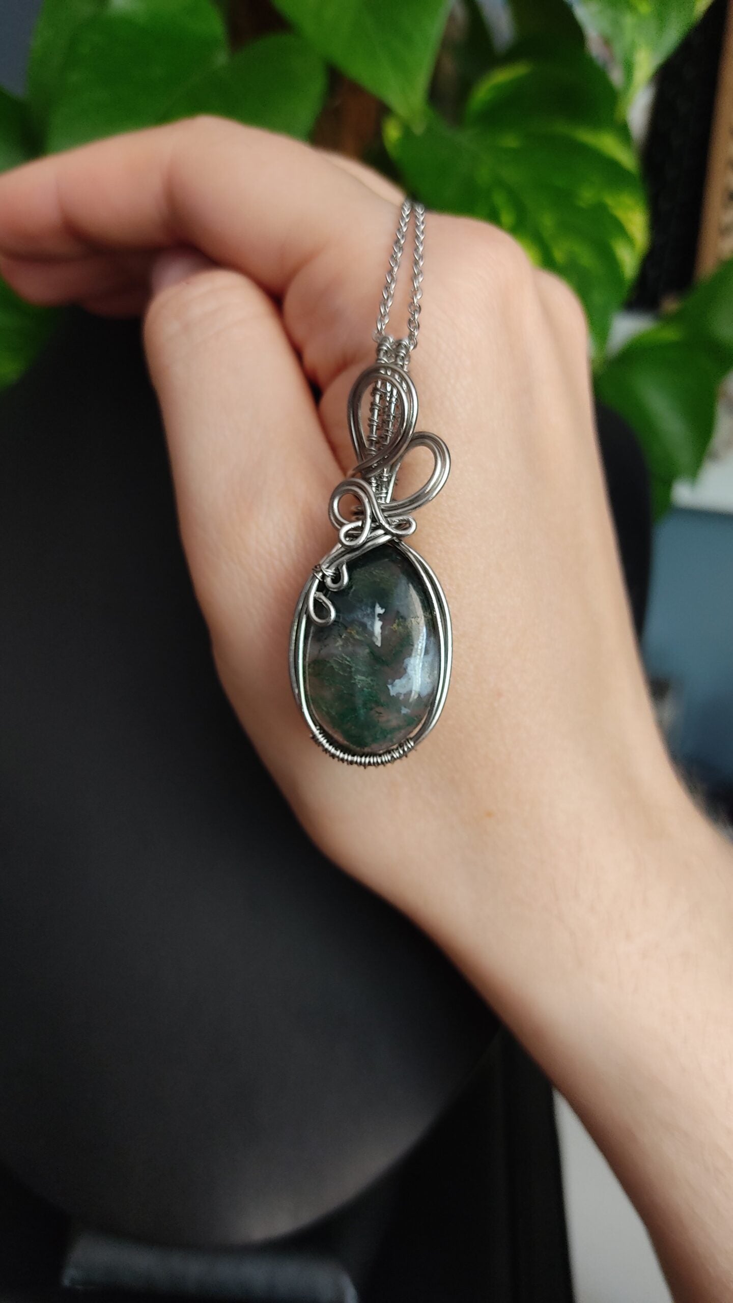 Ręcznie robiony wisiorek z agatem mszystym. Wykonany techniką wire wrapping z drutów ze stali chirurgicznej.