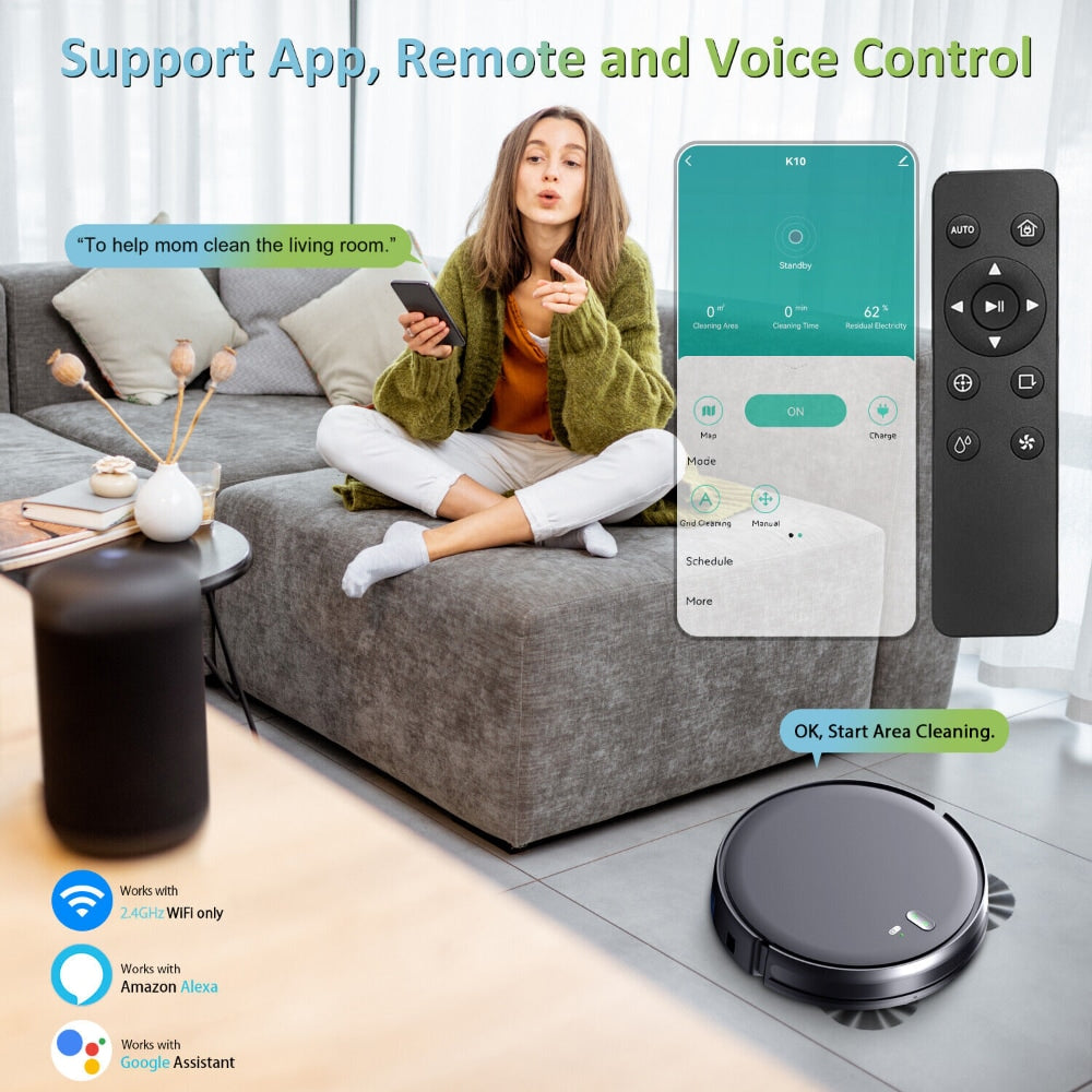 Sprzątaj bez podnoszenia ręki – automatyczny odkurzacz i urządzenie do czyszczenia podłóg posprząta Twój dom na dźwięk Twojego głosu, dzięki kompatybilności z systemami Google Assistant i Alexa. Jest kompatybilny z urządzeniami, które obsługują Google Home i Alexa.