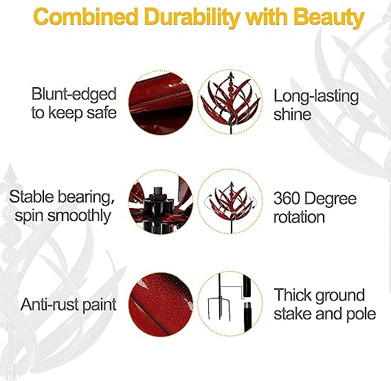 - Łatwy w montażu - Nasz przydomowy wiatrak ogrodowy nie wymaga żadnych wtyczek ani przewodów, jest łatwy w montażu zgodnie z instrukcją. Może być wystawiony przy drzwiach wejściowych lub w ogrodzie za domem. Bardzo duży rozmiar, łatwo przyciągnąć uwagę innych.