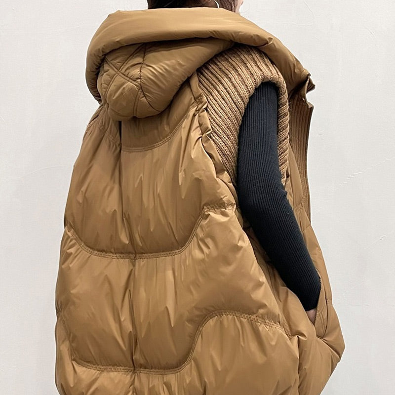Damska dzianinowa kurtka z patchworkowym puchem kaczym, bez rękawów