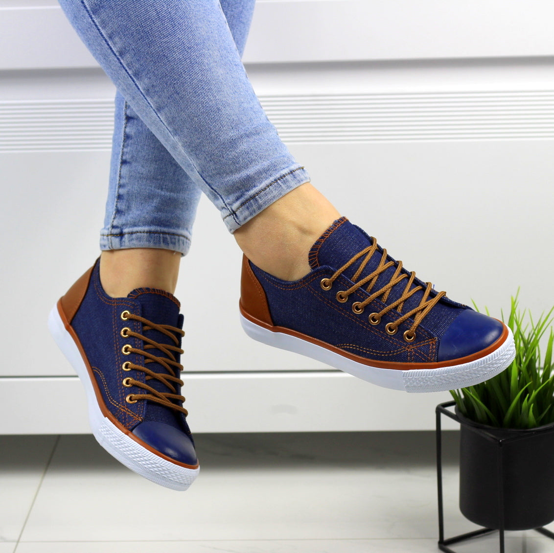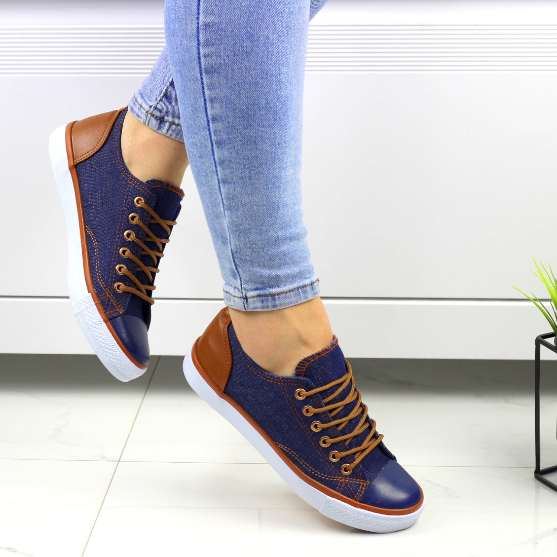 Blue sznurowane gładkie trampki damskie z brązowymi wstawkami