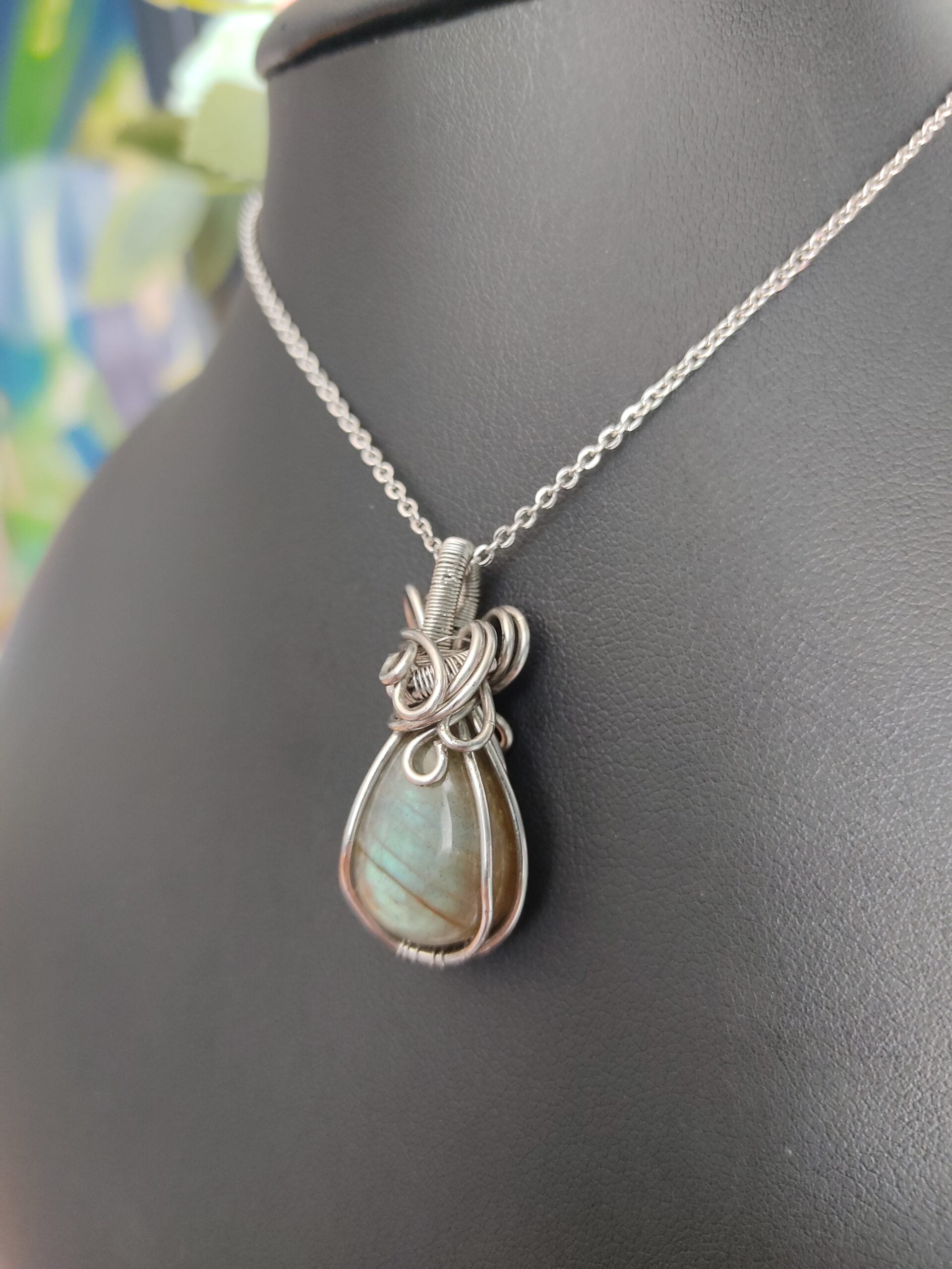 Ręcznie robiony wisiorek z labradorytem. Wykonany techniką wire wrapping z drutów ze stali chirurgicznej.