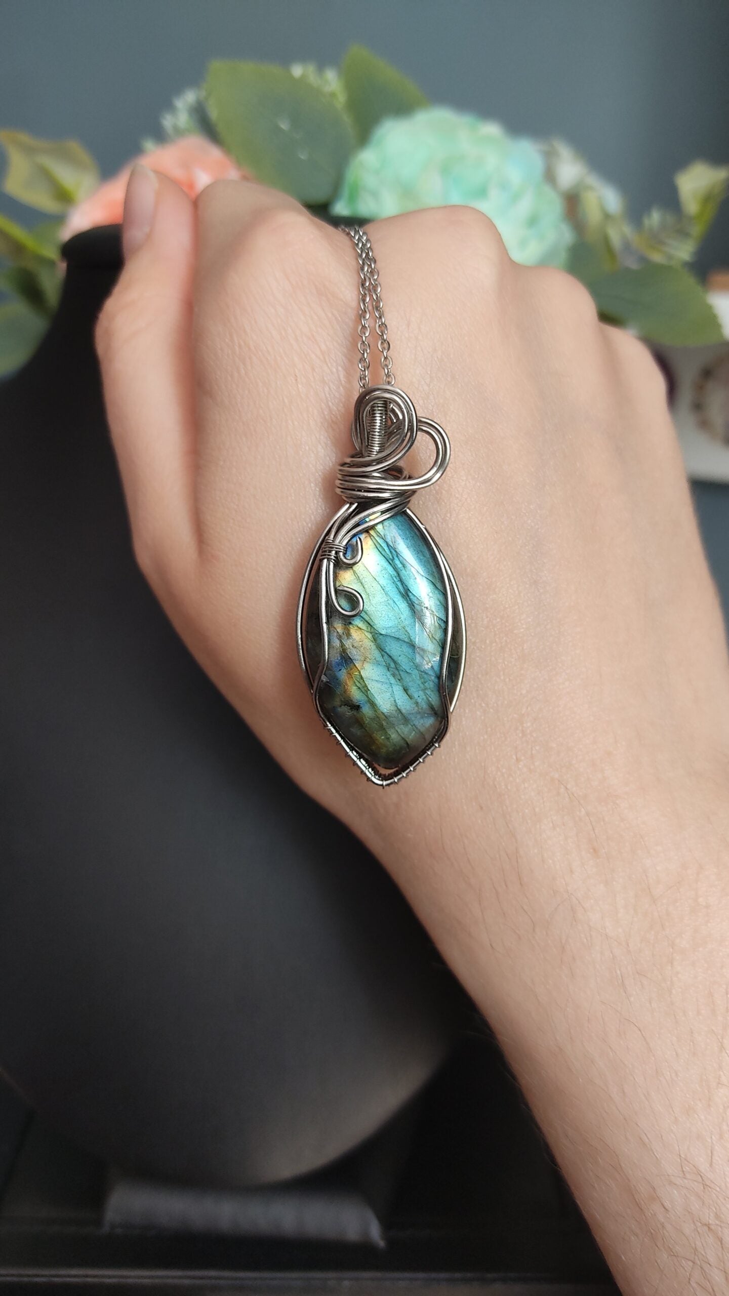 Ręcznie robiony wisiorek z labradorytem. Wykonany techniką wire wrapping z drutów ze stali chirurgicznej.