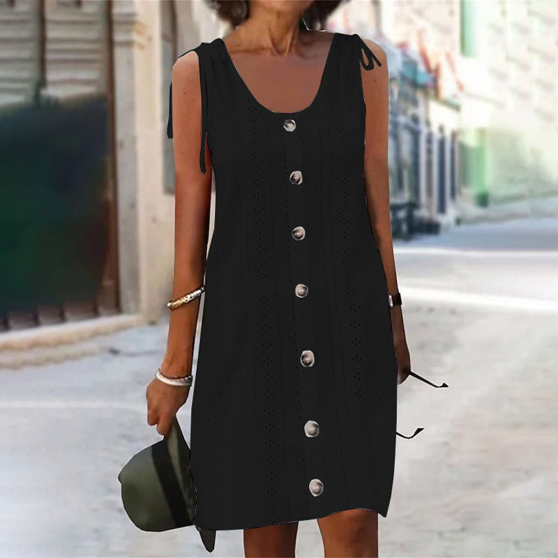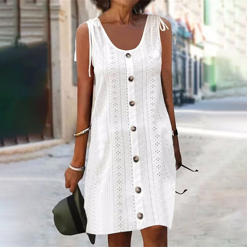 Ożyw swoją garderobę naszą dzianinową sukienką bez rękawów z dekoltem w kształcie litery U, wszechstronnym elementem, który łączy beztroski urok z nowoczesnym wdziękiem.