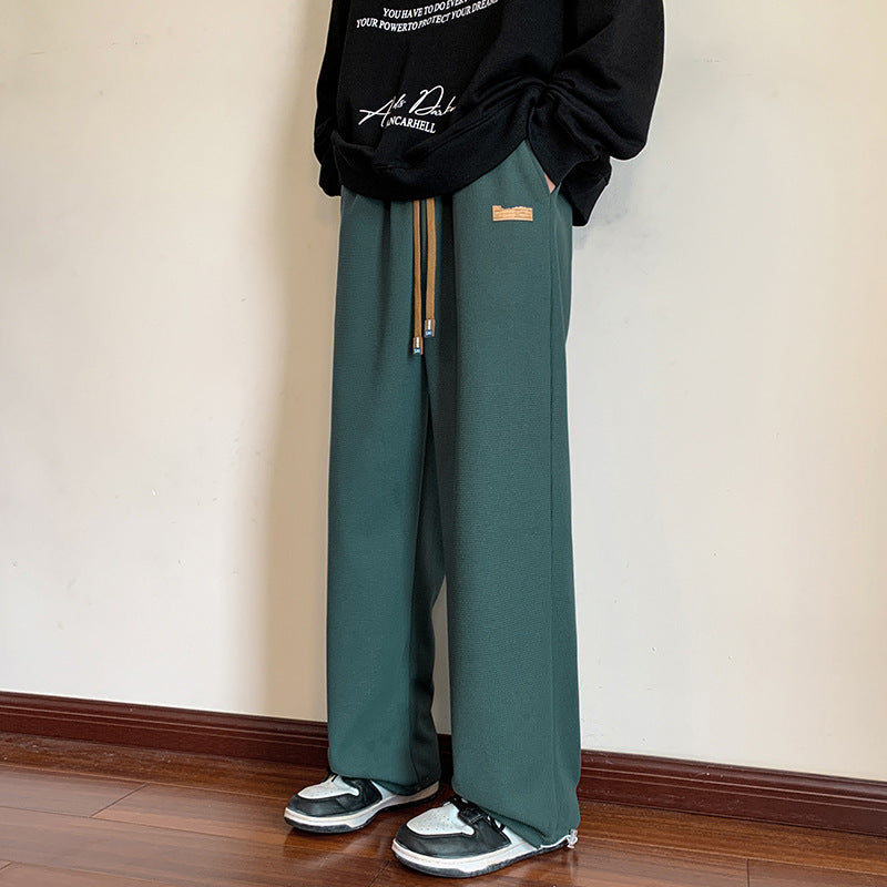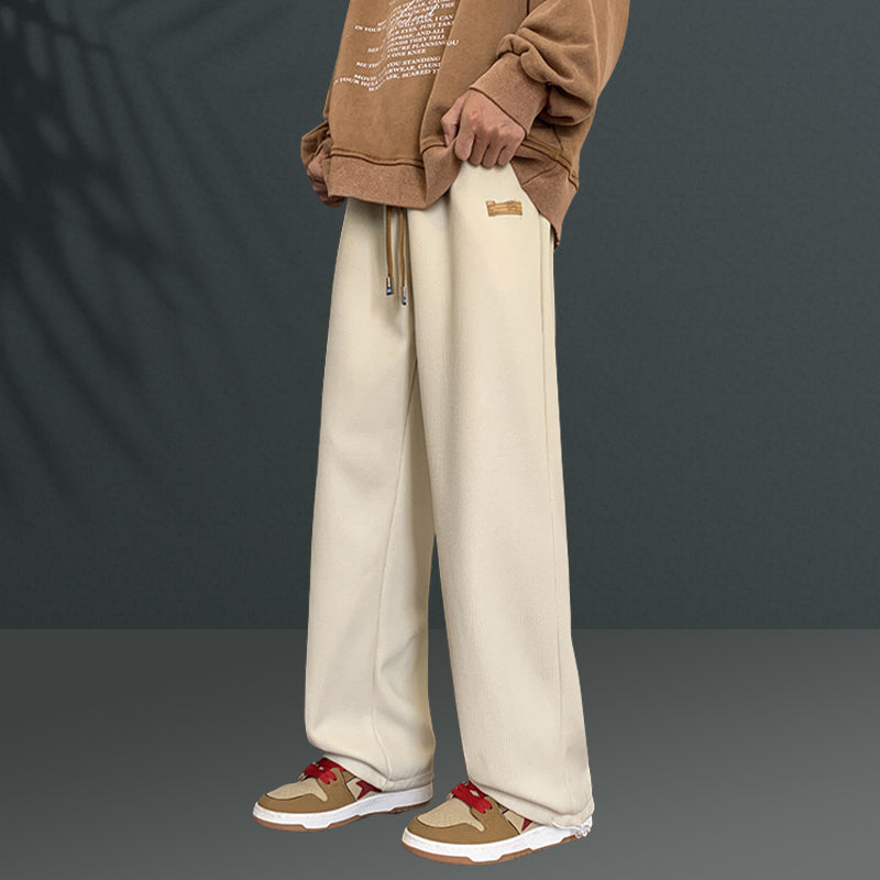 Te szerokie, dzianinowe spodnie męskie o prostych nogawkach, wykonane w 100% z poliestru, są wygodne w noszeniu i zapewniają swobodę ruchów, zapewniając maksymalny komfort. Przyjazny dla skóry materiał jest miękki i oddychający, a spodnie są odporne na zarysowania i zużycie, co zapewnia dodatkową trwałość.