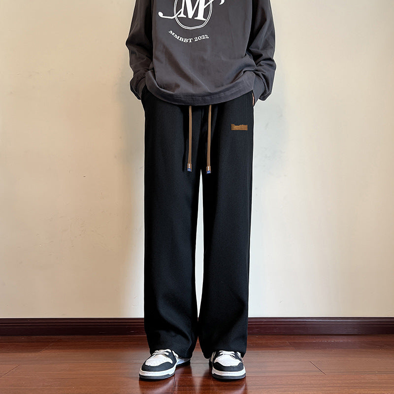 Męskie dzianinowe spodnie typu lounge z prostymi nogawkami i regulowaną elastyczną talią zapewniającą wygodne dopasowanie, dzięki czemu możesz ćwiczyć bez dyskomfortu i niepokoju.