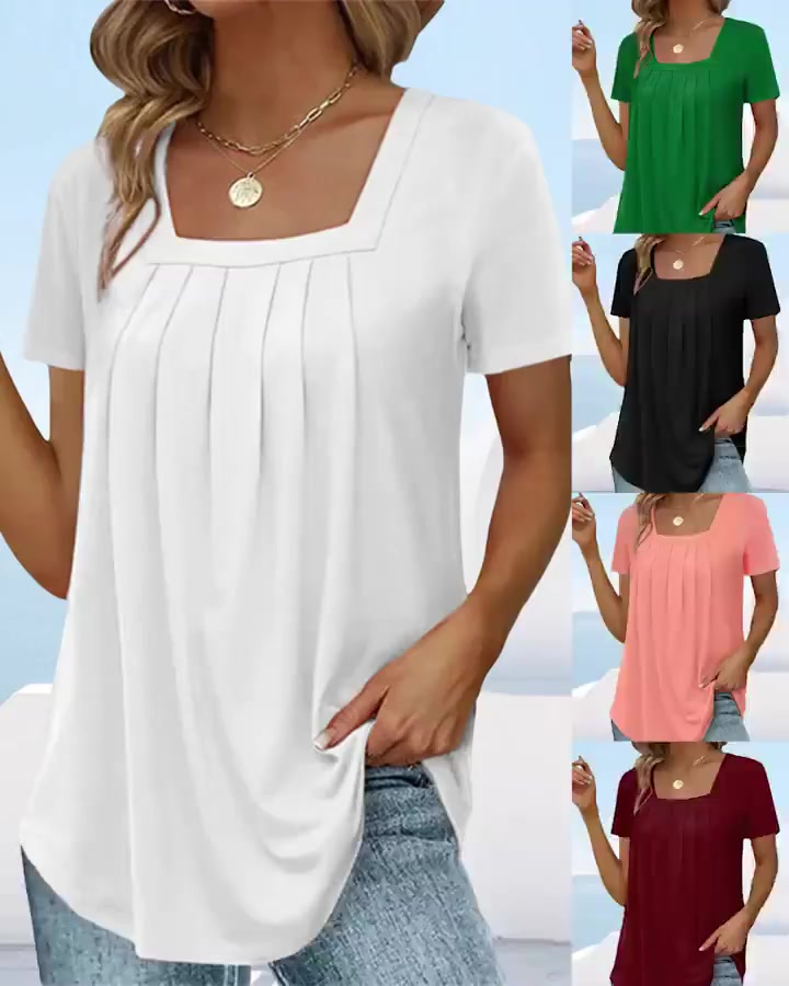 🎁Jednokolorowa koszulka z krótkim rękawem z kwadratowym dekoltem