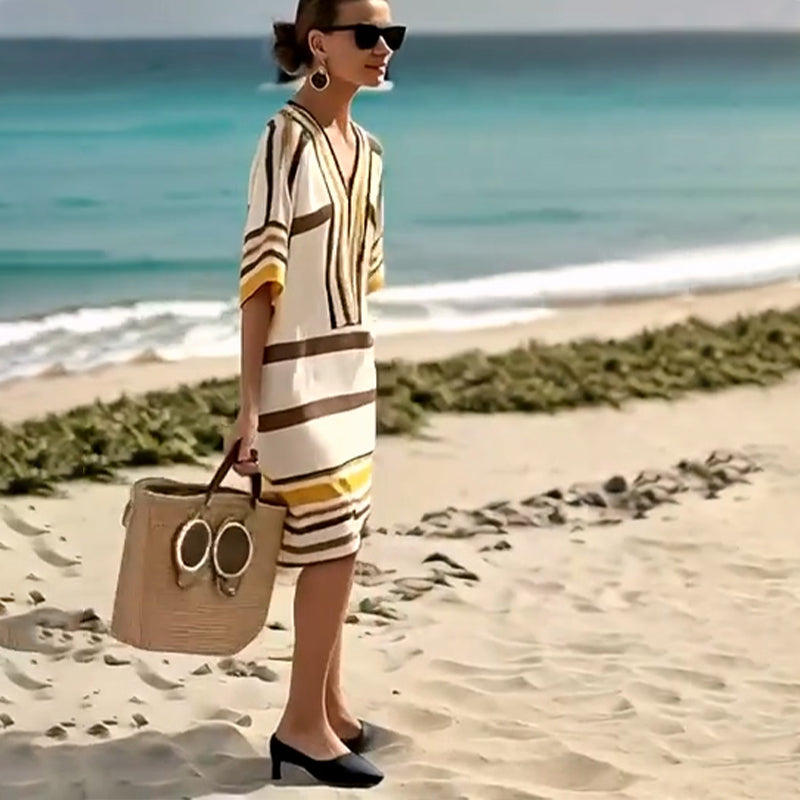 PLAŻOWY LOOK NA KAŻDĄ OKAZJĘ - Od nadmorskich wycieczek po weekendowe brunche - ta sukienka płynnie przechodzi między ustawieniami. Ubierz ją z dodatkami lub zachowaj prostotę z sandałami - wynik jest zawsze szykowny, zawsze gotowy na lato.