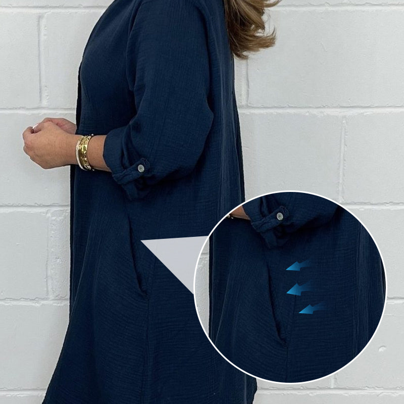 W skład zestawu wchodzi: 1 sukienka koszulowa w dużym rozmiarze z podwiniętymi rękawami i kieszeniami.