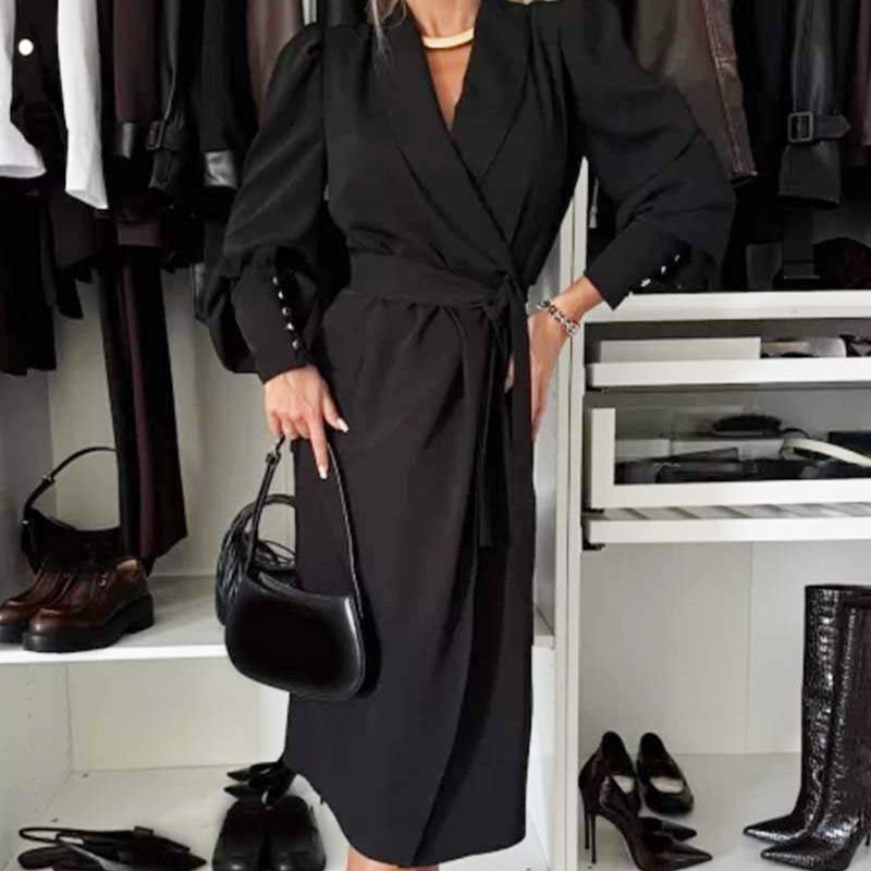 Damska sukienka z długim rękawem i dekoltem w szpic z wiązaniem w talii