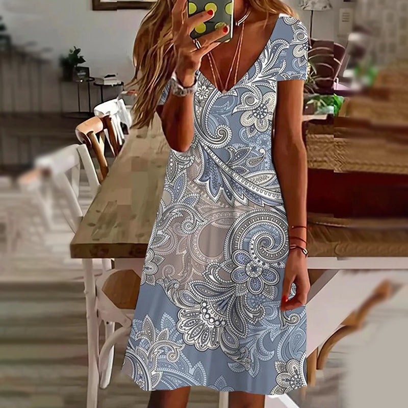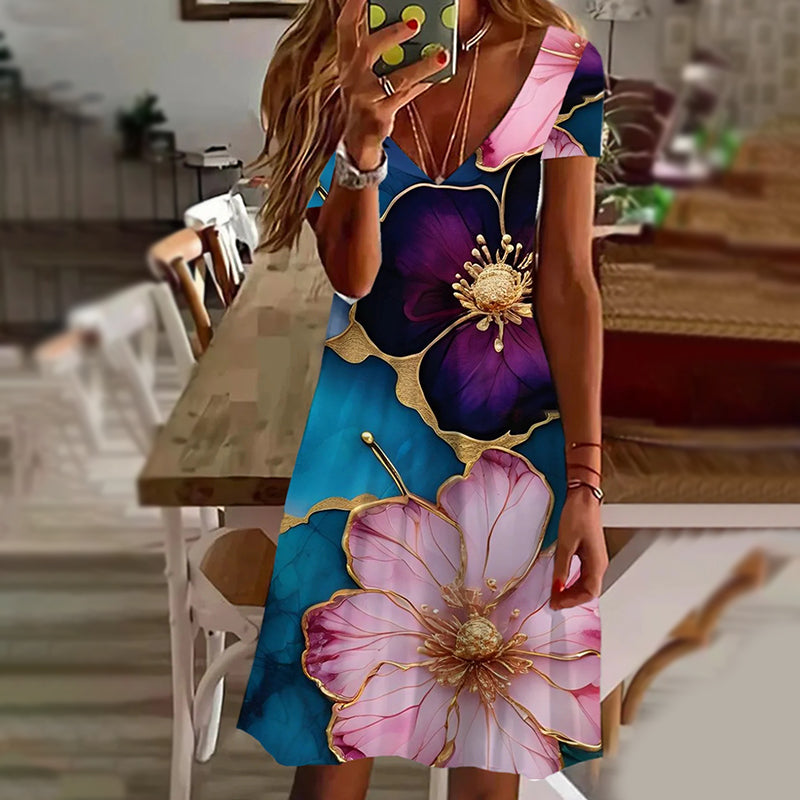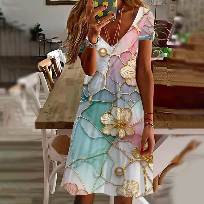 Pakiet zawiera: 1* Elegancka damska sukienka z dekoltem w serek z nadrukiem