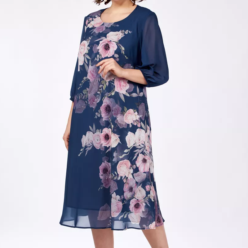 Elegancka sukienka z szyfonu z kwiatowym nadrukiem i okrągłym dekoltem
