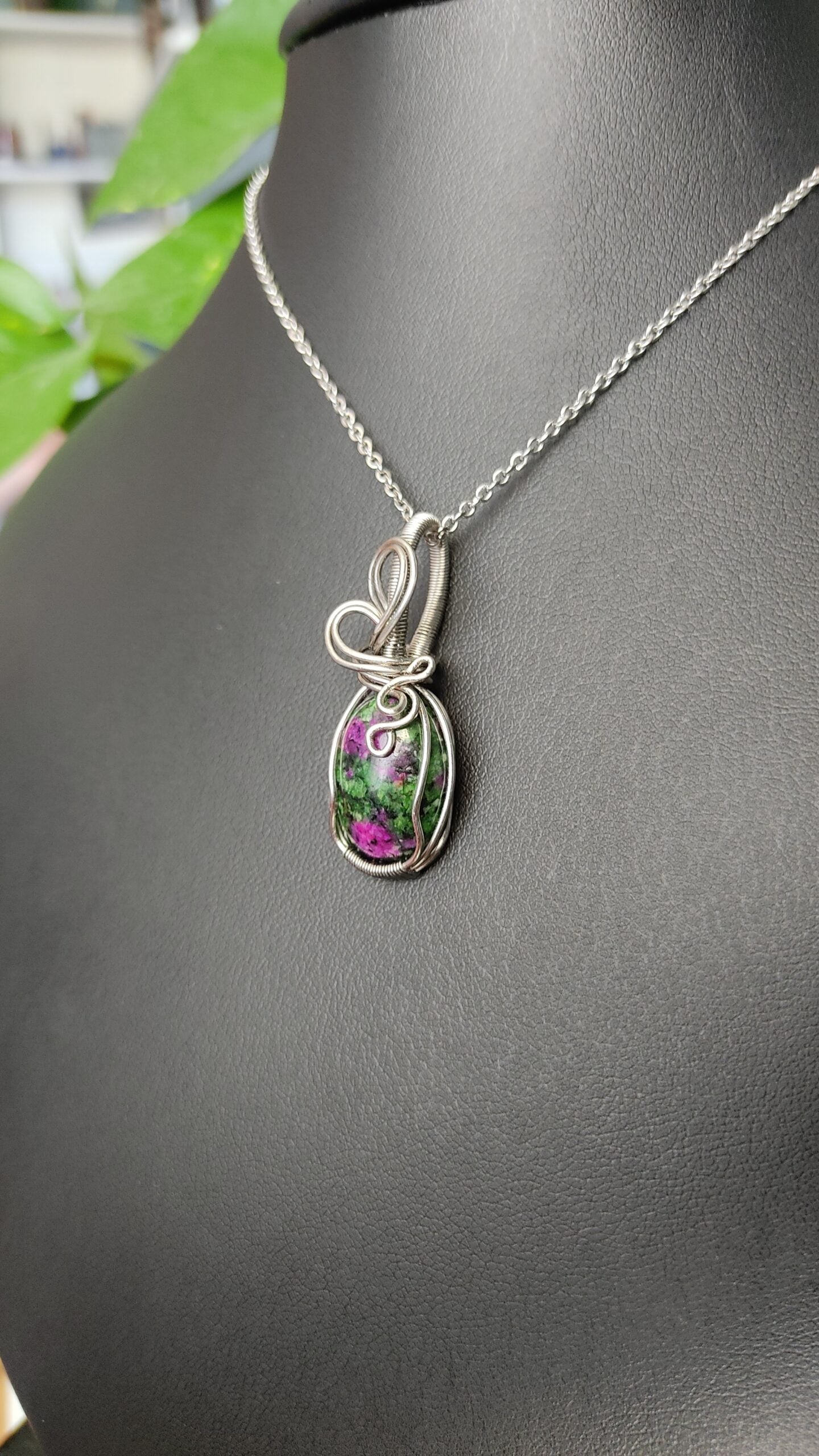 Ręcznie robiony wisiorek z zoisytem z rubinem. Wykonany techniką wire wrapping z drutów ze stali chirurgicznej.