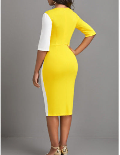 Żółta sukienka z okrągłym dekoltem i pół rękawem